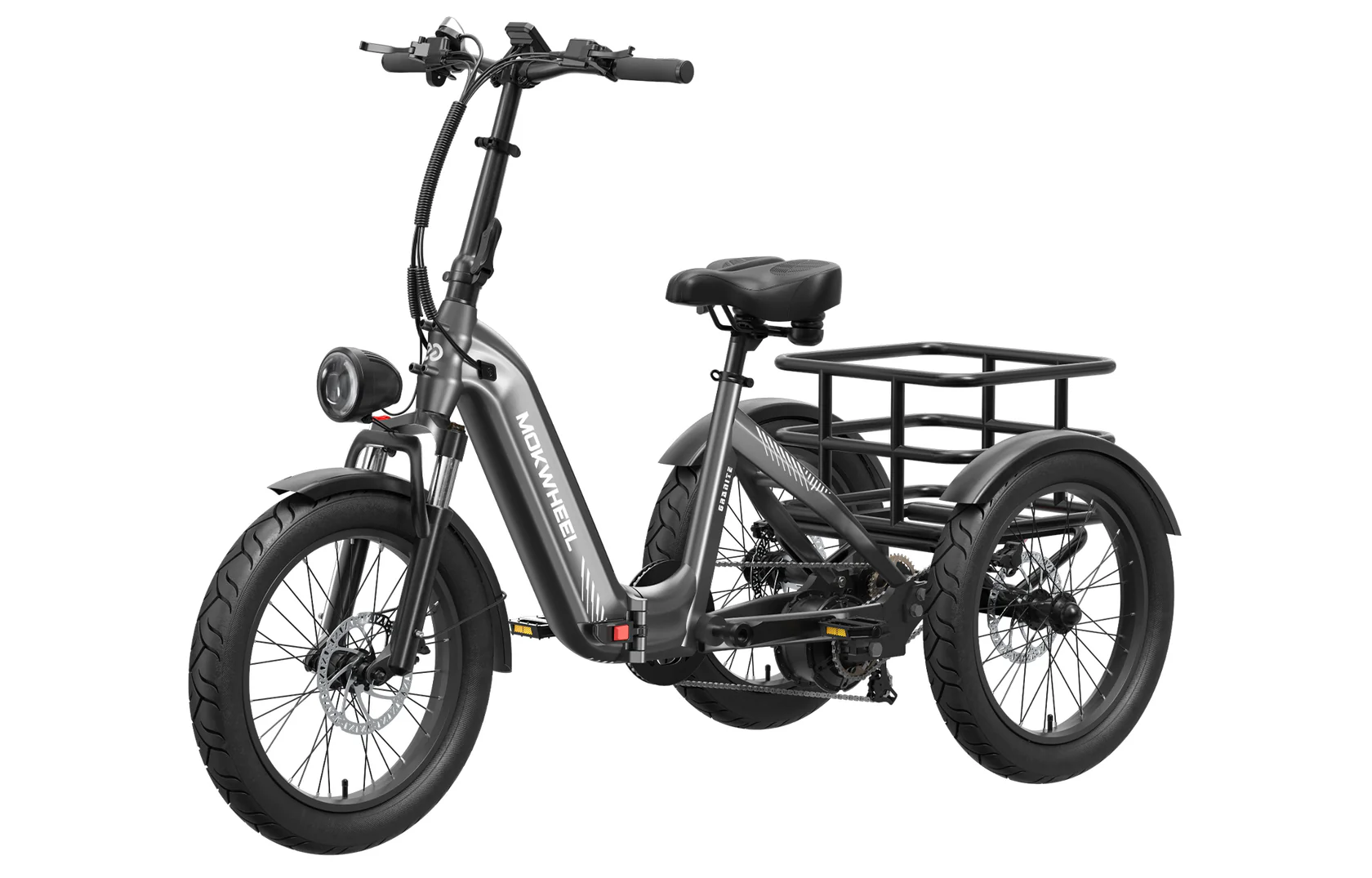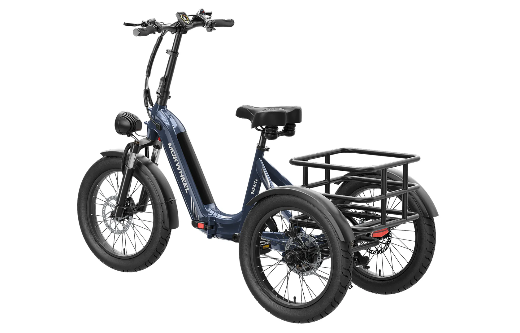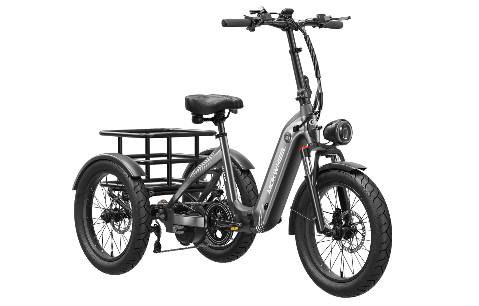 The Mokwheel Granite is equipped with a robust rear motor and a large rear rack. This electric tricycle allows you to transport everything from everyday necessities to gear for weekend escapes. Perfect for urban commuting and transporting family cargo. The Granite is also foldable, so if needed it can take up less space when stored. A perfect solution for riders with balance issues.